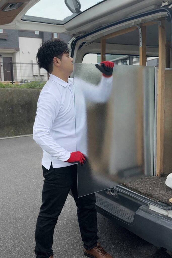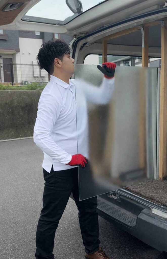 MADOSUKEガラス店では、作業車に透明ガラス・すりガラス・網入りガラスなど複数種類を常備しております。