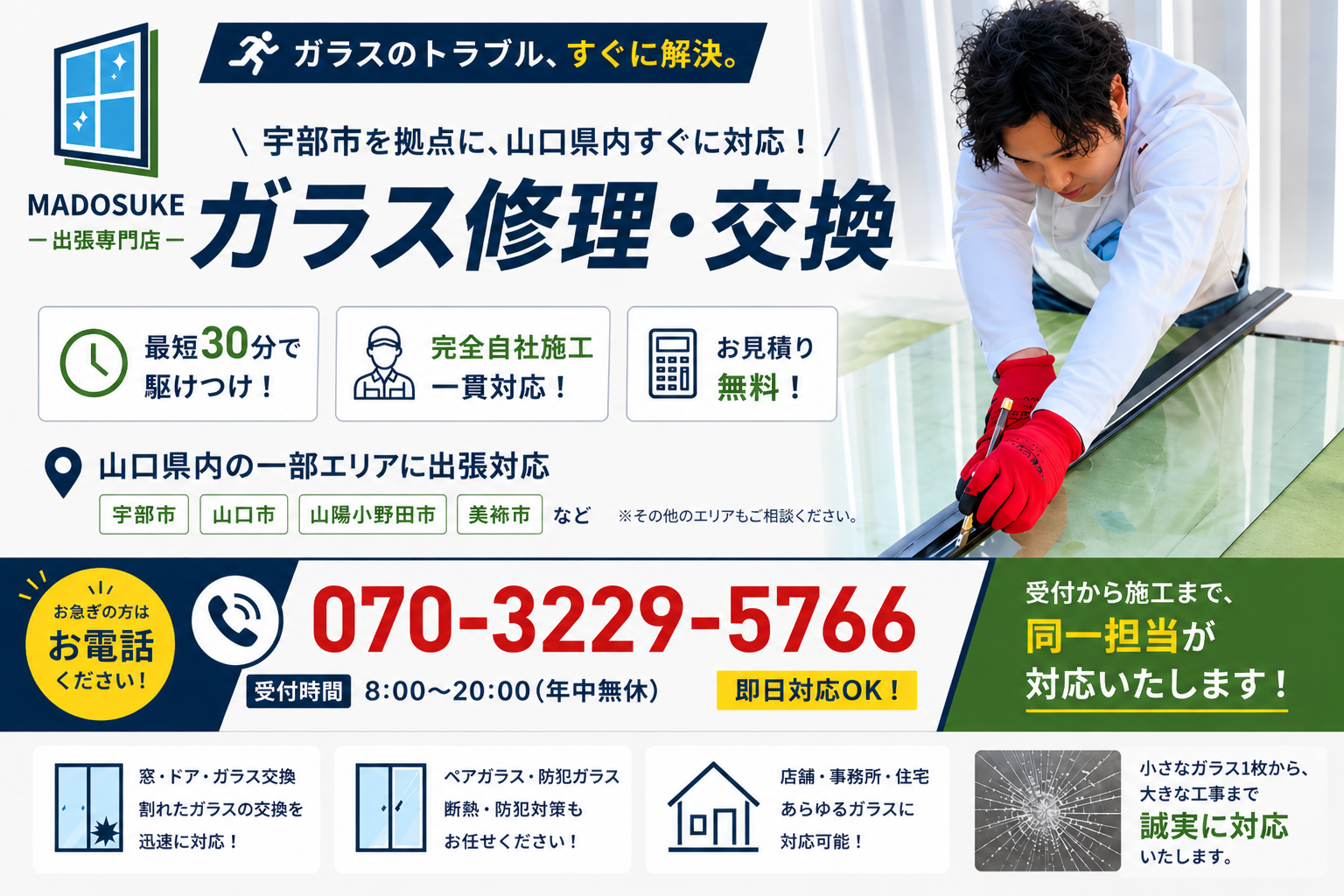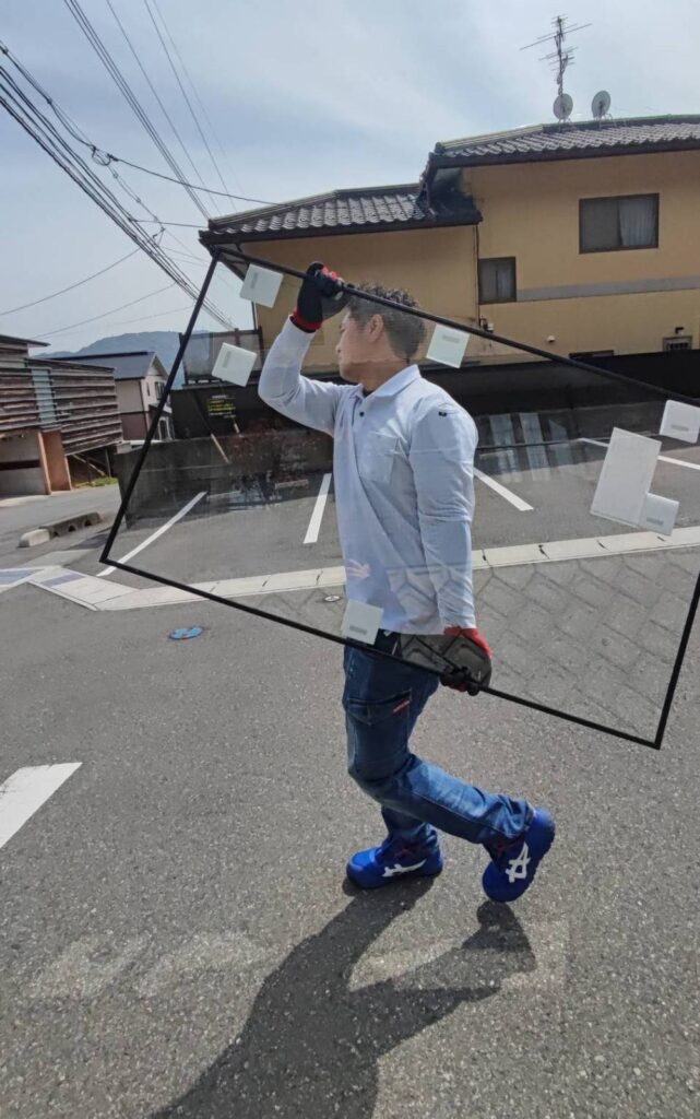宇部市内であれば、現地でサイズに合わせてガラスをカットし、その場で交換作業までご対応、急なガラス割れにも、スピーディーかつ丁寧に対応いたします。