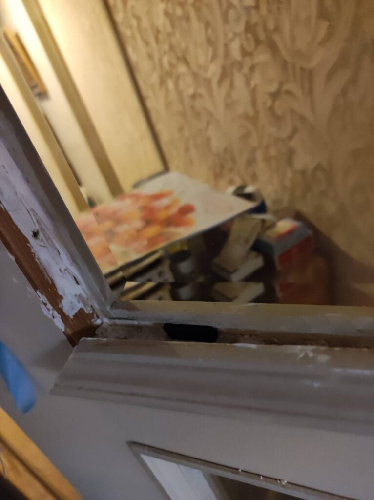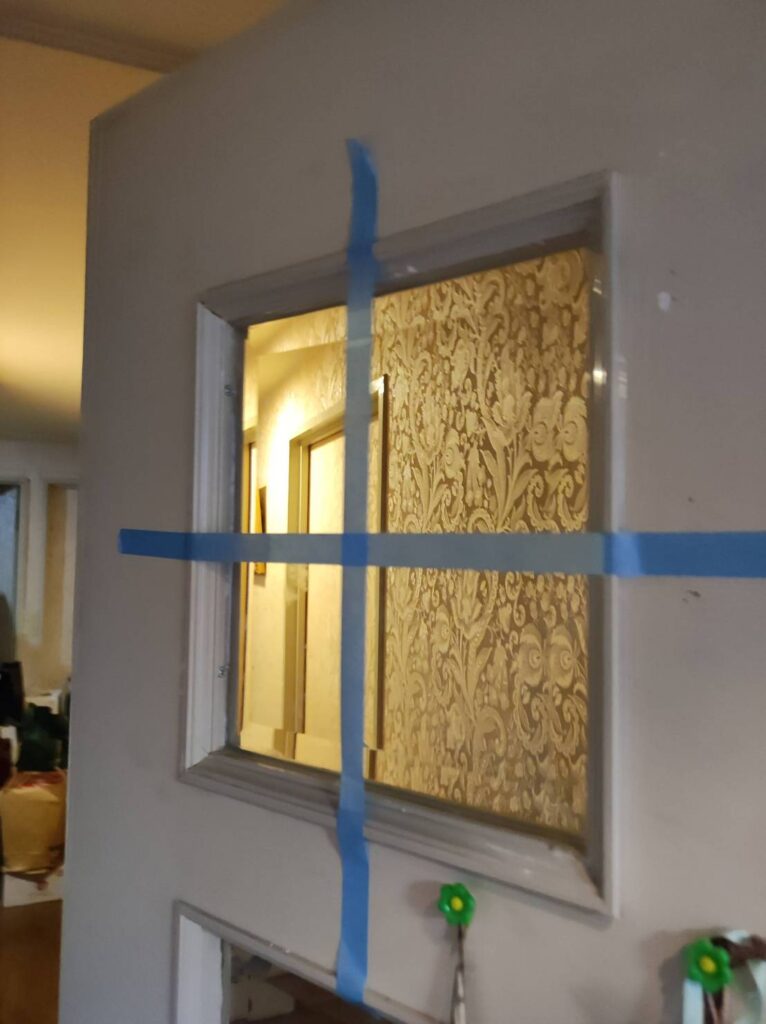 室内ドアに6面のガラスが組み込まれているタイプで、それ自体は特別珍しくもないのですが、ガラスを押さえる額縁が全て石膏素材で出来ており、パテで接着されているタイプは初めて見ました!