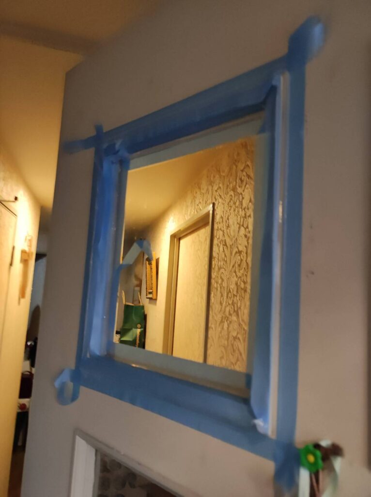 マスキングをしてコーキングしていきます!固まればネジがなくても額縁が外れないようにガッチリ固定できますし、取り外したいときはカッターナイフでコーキングを切れば外れます。