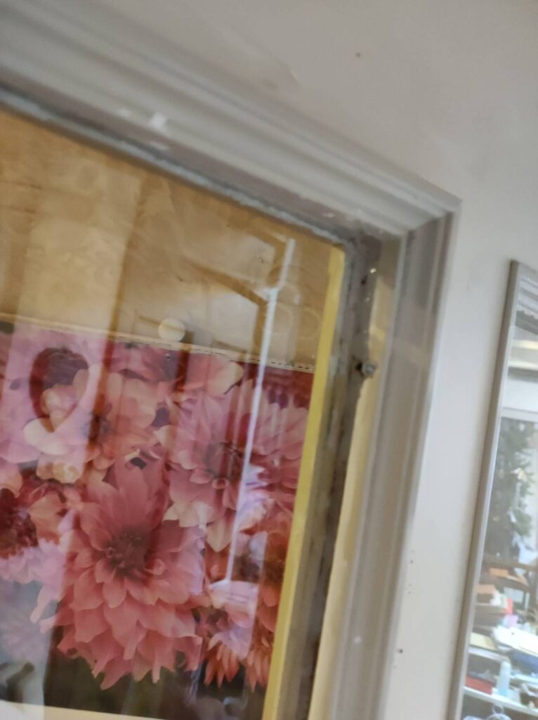 まずは残ったパテを綺麗に撤去して、ガラスを入れて額縁をはめ込んでいきます。ガラスの下にはクッションとしてゴム板をかませておきます!