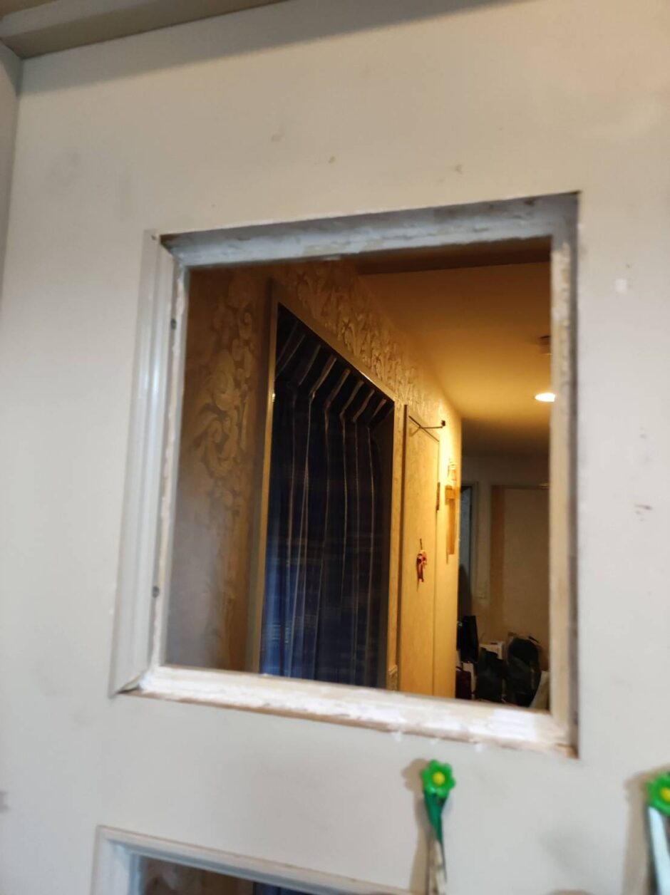 室内ドアに6面のガラスが組み込まれているタイプで、それ自体は特別珍しくもないのですが、ガラスを押さえる額縁が全て石膏素材で出来ており、パテで接着されているタイプは初めて見ました!