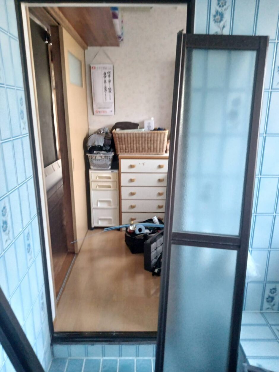 下地を整えて、写真のように、オーダー寸法で作成した浴室折れ戸枠を既設枠に嵌め込みます!ちなみに、当店は浴室折れ戸は発注後5日ほどで入荷します。