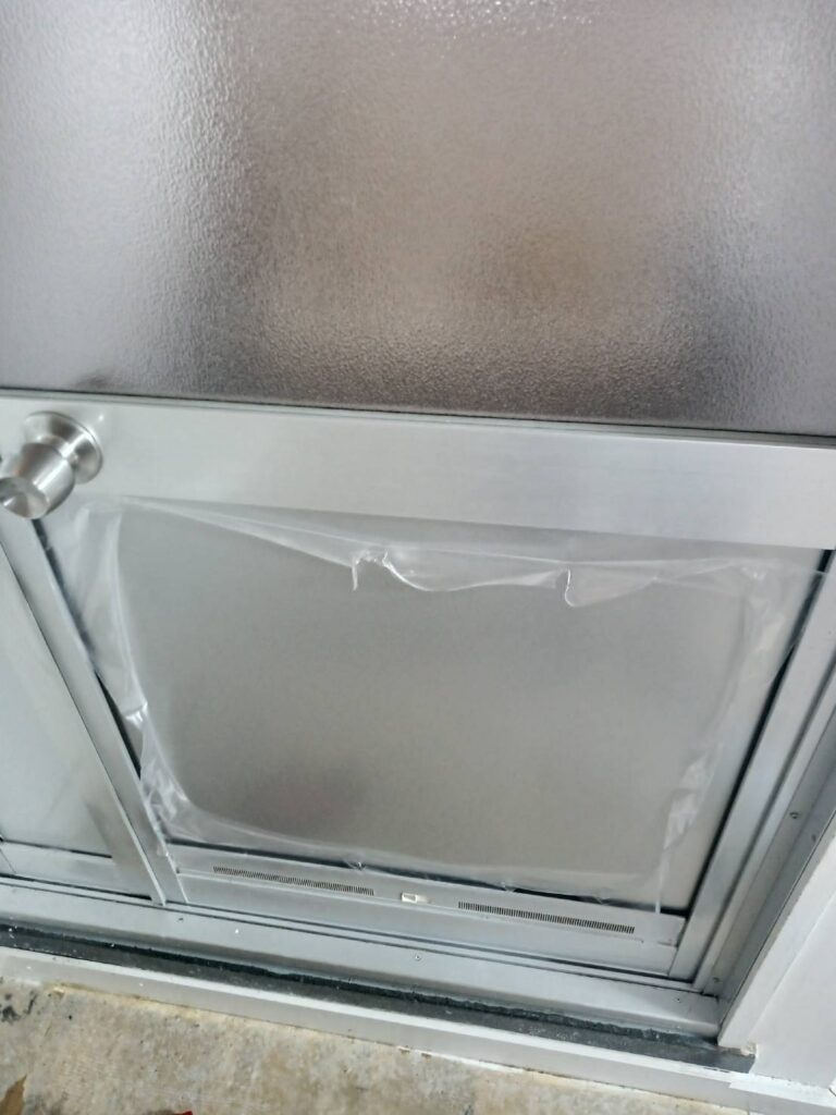 浴室ドアが外れましたら枠を分解していきます!効率よくいきたいので下框を外して、カットしたアルポリックを差し込んでいきます。ガラス溝にシリコーンスプレーを吹いて滑りやすくしてから、アクリルにグレチャンパッキンを巻き付けてスライドしながら差し込むのがコツです!