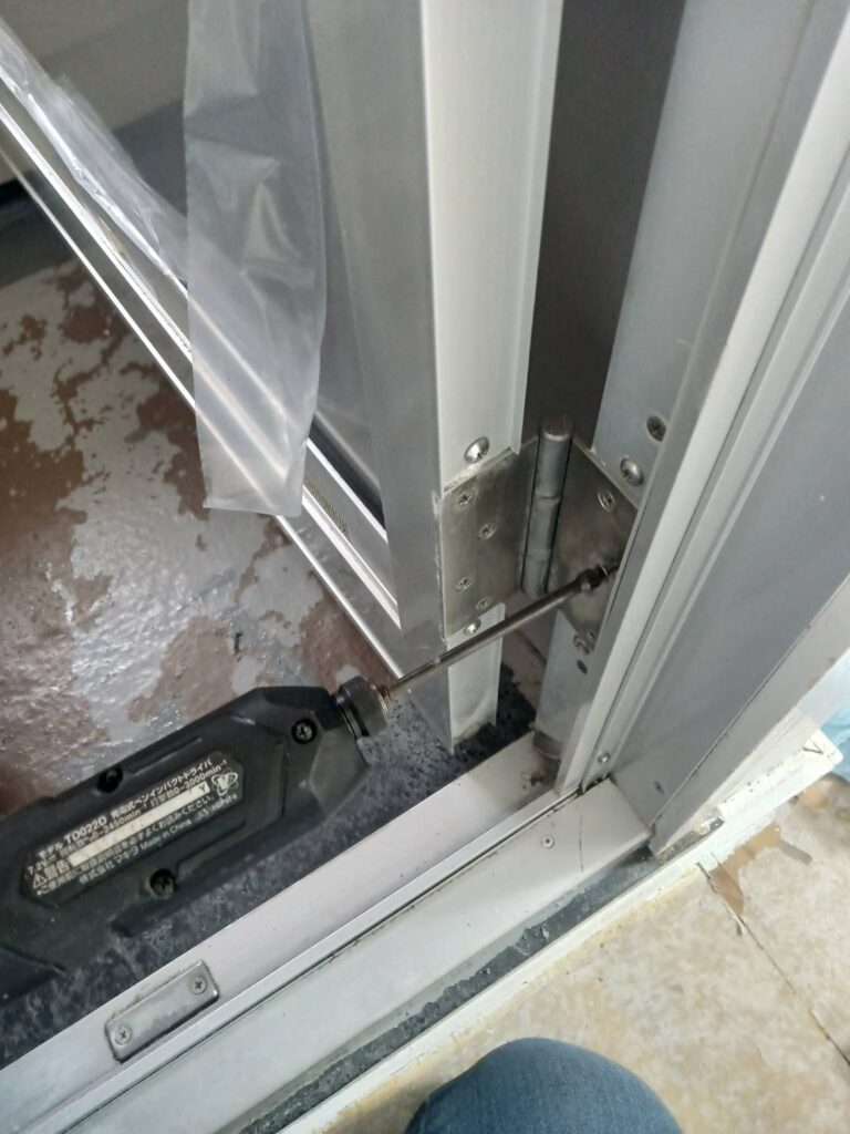 これですね、よくガラス屋さん以外の業者さんがやりがちですが、裏板をとめているビスまで外して丁番ネジが付かないなんてことになるケースがよくあります。そうなるとカバー工法でドア交換となりますから、まあ大変なことになります笑