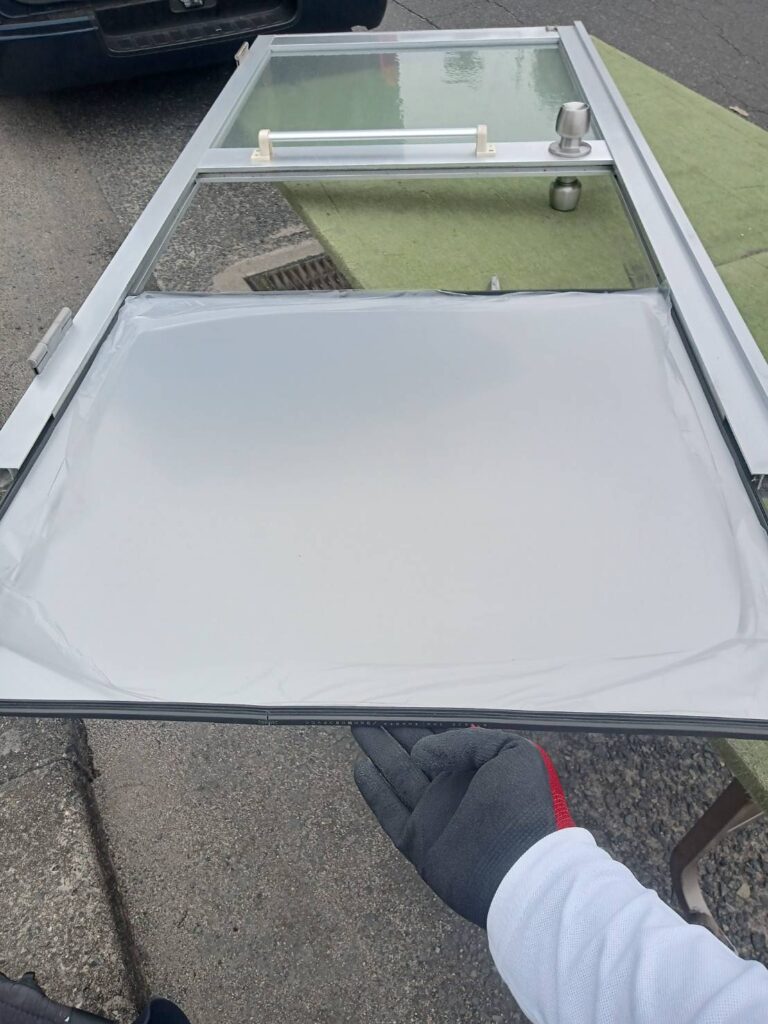 交換方法としては、開きドアを外して枠を分解してアルポリックを替えるという流れになります!