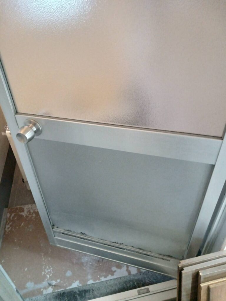 アルポリックはよく開きドアの中桟より下側に入っていて、浴室ドアや勝手口ドアでよく見るアルミ板のことです!ちょうど足元にガラスがくると割れやすく危ないという理由から、ガラスの代わりにアルポリックが入っていたりしますね!